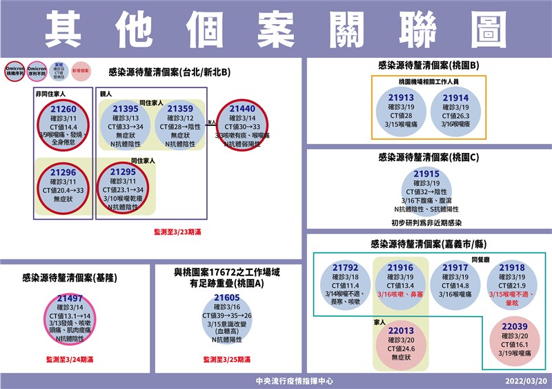 另一例嘉義縣個案(案22013),60多歲女性,為日前確診個案(案21916)的妻子,本身並未參加喜宴。於3月19日進行接觸者採檢,並於同日出現輕微咳嗽症狀。採檢陽性,Ct值18。