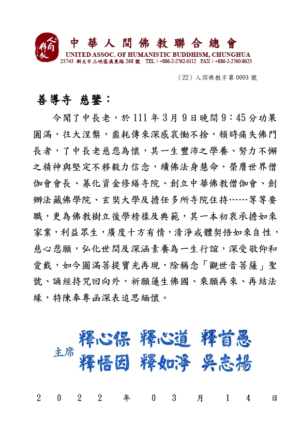 了中長老住世緣盡 中華人間佛教聯合總會拈香致意 李祖翔 |2022.03.21 語音朗讀 3560觀看次 字級 大 中 小 中華人間佛教聯合總會輪值主席心保和尚(前排左2)與首愚法師(前排左3)、監事長明光法師(前排右1),祕書長覺培法師與監事,主席吳志揚、卸任主席黃書瑋等,21日為9日住世緣盡的了中長老拈香致意。圖 / 記者張睿杰 【記者李祖翔台北報導】世界佛教僧伽會會長、台北市善導寺方丈暨玄奘大學創辦人了中長老3月9日住世緣盡,中華人間佛教聯合總會主席佛光山住持心保和尚、十方禪林開山方丈首愚法師、監事長明光法師、祕書長覺培法師,及主席國際佛光會世界總會法制長吳志揚、卸任主席黃書瑋與監事,21日上午前往善導寺拈香,表達教界對長老的敬仰與心意。心保和尚表示,「由於敬佩了中長老對佛教的貢獻及對教育的努力,中華人間佛教聯合總會特地前來致意」。敬輓也以垂範人間為題表達心意。中華人間佛教聯合總會輪值主席暨佛光山住持心保和尚拈香致意。圖 / 記者張睿杰中華人間佛教聯合總會監事長明光法師(右)拈香。圖 / 記者張睿杰黃書瑋與了中長老相識30多年,表示:「長老正直地弘揚佛教義理,值得學習的是興學毅力, 如玄奘大學創辦不易,但長老做到了,並為僧眾、弘法人才培養後起之秀,若人人都學了中長老推廣佛教的精神與毅力,社會就能祥和了。」新北市佛教會理事長、十方學舍住持如乘法師(右)向中華人間佛教聯合總會輪值主席心保和尚表達對聯合總會的感謝。圖 / 記者張睿杰新北市佛教會理事長、十方學舍住持如乘法師說:「師父了中長老和星雲大師曾是同學,緣分深厚,儘管一個在北一個在南,但弘法利生的目的是一致的,感謝中華人間佛教聯合總會到來拈香致意,真的很感謝。」中華人間佛教聯合總會祕書長覺培法師(前排左2)率總會監事法師一同至追思會上誦經。圖 / 記者張睿杰了中長老高齡91歲,僧臘83年,戒臘76載,在中國佛教會擔任祕書長15年,奠定發展基礎,並創辦玄奘大學;1987年受聘善導寺住持,1992創立中華佛教僧伽會,擔任兩屆八年理事長,領導群僧,1997年兼任善導寺董事長;2000年受推舉為世界佛教僧伽會會長。了中長老一生行事低調,2020年預下遺囑,包括臨終時不得用任何方式急救以延長生命;入滅後不發喪,不發訃聞,不舉行讚誦會,不舉行封龕說法等儀式;一切禮懺、放燄口、超度等佛事莫做,來慰唁者,請念觀世音菩薩聖號以助念。善導寺擇於3月22日上午7時發龕,舉火荼毗, 靈骨奉安於善導寺往生堂。中華人間佛教聯合總會發函善導寺,表達對了中長老的追思與緬懷。圖/中華人間佛教聯合總會提供 前一篇文章 依空法師專題演講 暢談「佛教與文學」 下一篇文章 統測准考證23日寄發 四技二專報考生創新低 熱門新聞 01【讓愛自由】纏繞與獨立之間2026.04.0202新生首次到校2026.04.0203星雲大師靈骨分燈泰國 化益世人2026.04.0204打字機重返課堂 對抗AI代寫2026.04.0205租賃車業者違法攬客 觀光署:最高罰200萬元2026.04.0706緬甸佛學院訪佛光山 深化教育弘法發展2026.04.0207日月潭蓄水率 跌破6成2026.04.0208睡足多運動常吃蔬菜 改善生活習慣促健康2026.04.0209徐若熙日職初登板 6局6K奪首勝2026.04.0210奧斯陸佛光童軍 體驗禪修學滑雪2026.04.02 訂閱電子報 台北市 天氣預報 台灣一週天氣預報 相關報導 鄭麗文會宋濤:兩岸非註定一戰鄭麗文今訪陸 預計4月10日晤習台澎海空疏運高峰 逾8千人提前返台海軍敦睦艦隊 進入巴拿馬運河中油高雄大林廠火警 環保局開罰桃機3航廈屋頂 設10公里天溝 作者其他文章家扶無窮世代計畫 5千萬元缺口待補 憂YTR倡偏方 陽光急闢謠:燒燙傷快「沖冷水」2022金扶獎頒獎 賴清德勉勵5位自立「家扶兒」淨灘、立槳到吃素 培力園帶孩子體驗生活新風貌讓愛流動 祖父母為己立傳邀祖父母為自己立傳 壯世代讓家庭的「愛」流動