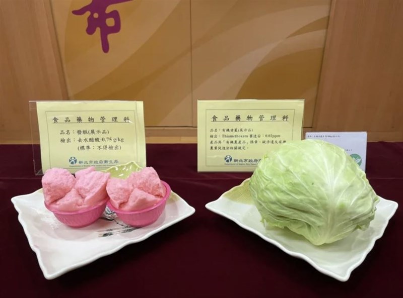 衛生局查獲含農藥及防腐劑的食材,已要求業者下架回收,其中查獲標榜有機的甘藍竟驗出農藥。圖/新北市衛生局提供