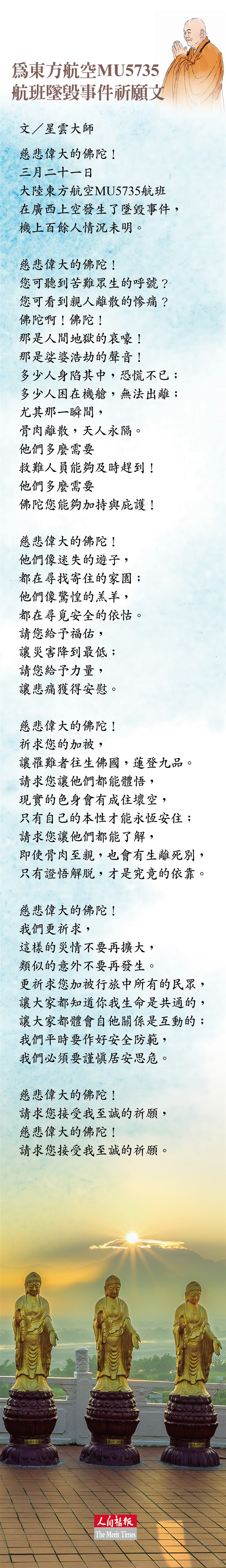 星雲大師 為東方航空MU5735航班墜毀事件祈願文 |2022.03.22 語音朗讀 8586觀看次 字級 大 中 小 圖/資料照片 文╱星雲大師慈悲偉大的佛陀!三月二十一日大陸東方航空MU5735航班在廣西上空發生了墜毀事件,機上百餘人情況未明。慈悲偉大的佛陀!您可聽到苦難眾生的呼號?您可看到親人離散的慘痛?佛陀啊!佛陀!那是人間地獄的哀嚎!那是娑婆浩劫的聲音!多少人身陷其中,恐慌不已;多少人困在機艙,無法出離;尤其那一瞬間,骨肉離散,天人永隔。他們多麼需要救難人員能夠及時趕到!他們多麼需要佛陀您能夠加持與庇護!慈悲偉大的佛陀!他們像迷失的遊子,都在尋找寄住的家園;他們像驚惶的羔羊,都在尋覓安全的依怙。請您給予福佑,讓災害降到最低;請您給予力量,讓悲痛獲得安慰。慈悲偉大的佛陀!祈求您的加被,讓罹難者往生佛國,蓮登九品。請求您讓他們都能體悟,現實的色身會有成住壞空,只有自己的本性才能永恆安住;請求您讓他們都能了解,即使骨肉至親,也會有生離死別,只有證悟解脫,才是究竟的依靠。慈悲偉大的佛陀!我們更祈求,這樣的災情不要再擴大,類似的意外不要再發生。更祈求您加被行旅中所有的民眾,讓大家都知道你我生命是共通的,讓大家都體會自他關係是互動的;我們平時要作好安全防範,我們必須要謹慎居安思危。慈悲偉大的佛陀!請求您接受我至誠的祈願,慈悲偉大的佛陀!請求您接受我至誠的祈願。 前一篇文章 李斯特菌金針菇來自多縣市 彰化衛生局追查來源去向 下一篇文章 全聯加薪6%另有激勵獎金 好市多時薪調幅14% 熱門新聞 01苗栗漁港冒藍眼淚 縣府將檢測水質2026.03.3102祖厝大變身 王榮文打造農夫美術館2026.03.3103明德水庫蓄水量僅27% 今起供4停42026.04.0104星雲大師靈骨分燈日本 法燈長明2026.04.0105【讓愛自由】纏繞與獨立之間2026.04.0206新生首次到校2026.04.0207佛光會理監事會議 佛光精神深耕全球2026.03.31089公尺高恐龍 現身澄清湖2026.04.0109東京櫻花滿開2026.04.0110星雲大師靈骨分燈泰國 化益世人2026.04.02 訂閱電子報 台北市 天氣預報 台灣一週天氣預報 相關報導 台澎海空疏運高峰 逾8千人提前返台海軍敦睦艦隊 進入巴拿馬運河中油高雄大林廠火警 環保局開罰桃機3航廈屋頂 設10公里天溝國民黨中常會 提名台中、澎湖、竹縣長中美並重 鄭麗文傳6月訪美
