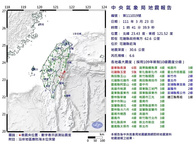 01:41規模6.6地震 最大震度台東6弱 |2022.03.23 語音朗讀 1571觀看次 字級 大 中 小 今天凌晨1時41分發生芮氏規模6.6地震。圖/氣象局 【本報綜合報導】深夜地牛翻身。中央氣象局地震報告指出,1:41發生規模6.6地震,震央花蓮縣近海深31km,最大震度東6-花5+投4嘉4、高4雲4中4宜4南4彰4苗4竹4屏3桃3北3澎2馬1。 前一篇文章 蒙古籍貨輪沈沒台籍船員失蹤 搜救行動持續中 下一篇文章 【星雲大師如是說】緣 熱門新聞 01佛光會參與COP30 推廣環保與心保2025.11.1302新馬寺大專佛學生活營 學習生活中覺有情2025.11.1303法華禪寺皈依典禮 佛子開啟修行旅程2025.11.1304球星陳傑憲出書 盼助人跨過低潮2025.11.1305【相守一輩子】 學習向另一半求助2025.11.1306璀璨燈光 映照千年運河2025.11.1307土耳其運輸機墜毀 20軍人罹難2025.11.1308【觀我望己】追日,散策旅程 (下)2025.11.1309健力世錦賽 中華隊再奪3金2025.11.1310習近平會西班牙國王 盼成戰略夥伴2025.11.13 訂閱電子報 台北市 天氣預報 台灣一週天氣預報 相關報導 【星雲大師如是說】處事禪心【星雲大師如是說】人間佛教【星雲大師如是說】正信之美【星雲大師如是說】輪轉相繼【星雲大師如是說】有情的層次【星雲大師如是說】六忍歌