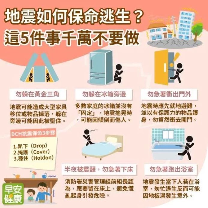 睡夢中遇大地震怎麼辦 最好逃生方法「留在床上」 |2022.03.23 語音朗讀 9838觀看次 字級 大 中 小 23日凌晨芮氏6.6級大地震震撼全台,台南市消防局第六大隊長大隊長邱淵明說,半夜被震醒,民眾不要急著下床,留在床上最恰當,因為較不會被移位的家具或床鋪撞到。圖/Unsplash 【本報台南訊】23日凌晨芮氏6.6級大地震震撼全台,許多民眾在睡夢中被驚醒,後續餘震不斷,截至下午3時已有62個餘震。民眾都有「睡夢中遇上地震該不該跑? 」的疑問。台南市消防局第六大隊長大隊長邱淵明說,半夜被震醒,請民眾不要急著下床,留在床上最恰當,因為較不會被移位的家具或床鋪撞到。邱淵明表示,地震的應變要領應是針對可防護的狀況思考,防護重點是避免被掉落物品,或是移位翻覆家具打到,並避免搖晃時跑動跌倒。至於遇到地震的原則,邱淵明說,先求活命,再談逃出,不要躲在黃金三角。近年不斷流傳地震避難時要躲在「黃金三角」,被國內外許多專家打臉。所謂黃金三角,即是「生命三角理論」(Triangle of Life)是由加拿大人庫普(Doug Copp)提出,他認為,當建築物倒塌時,會在家具周圍留下一些空間,建議地震時要躲在桌子、床櫃、沙發等大型家具旁邊。但許多專家指出,房屋搖晃時,可能造成大型家具移位,甚至是物品掉落砸傷人。民眾無法判斷家具倒下的方向,躲在旁邊反而可能因此被壓住。圖/消防署提供「勿急著衝出門外。」邱淵明表示,在一般建築物內仍以就地避難為主,盡可能以堅固桌子,或其他具有防護力物品保護自己身體,而不是貿然衝去開門。如要確認家人安全,也建議等到地震停止再移動。網路謠傳躲在冰箱旁邊,可以確保受困時有食物可維生。但大多數家庭的冰箱並沒有固定,地震劇烈搖晃時,反而可能先因為傾倒而傷人。地震發生當下人如剛好在浴室,切記勿慌張,邱淵明說,匆忙逃生反而可能因為地板溼滑跌倒、發生意外。浴室中沒有大型家具或吊掛物,其實相對是較安全的地方。如在泡澡可將頭部低於浴缸邊緣,用手護住頭頸部。最後邱淵明指出,地震避難移動時,減少撥打非緊急電話,因地震發生後電話線路可能異常。勿搭電梯,因為有被困住的危險。勿赤腳行動,避免被物品碎片割傷。勿開車,避免阻礙軍警消、救護車等救災。勿單獨從事救援行動,避免救人不成,反而造成自身受傷。圖/Unsplash 前一篇文章 改善視聽教室設備 全台1338校受惠 下一篇文章 美與盟友擬將俄踢出G20 中印恐持反對票 熱門新聞 01推動科學辦案 鑑識權威李昌鈺87歲辭世2026.03.2902佛光山月光寺啟用 花蓮心靈新地標2026.03.2903道奇頒冠軍戒 大谷喊要更多枚2026.03.2904中職開幕戰 猿隊險勝兄弟2026.03.2905川普誇耀政績 陸採購大豆倍增2026.03.2906最大規模無王日 逾3200場反川示威2026.03.3007汽油飆漲 1.7 元 創 11 年半新高2026.03.2908宜蘭綠博會 探索真理2026.03.3009陸首都維安 北京全面管制無人機2026.03.3010MLB 鄧愷威轉隊太空人 初登板奪首勝2026.03.30 訂閱電子報 台北市 天氣預報 台灣一週天氣預報 相關報導 桃機3航廈屋頂 設10公里天溝國民黨中常會 提名台中、澎湖、竹縣長中美並重 鄭麗文傳6月訪美景氣分數衝高 燈號連3紅8萬小草力挺 柯:我不投降 718億新興計畫預算 政院不動