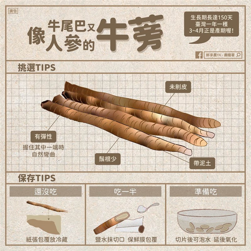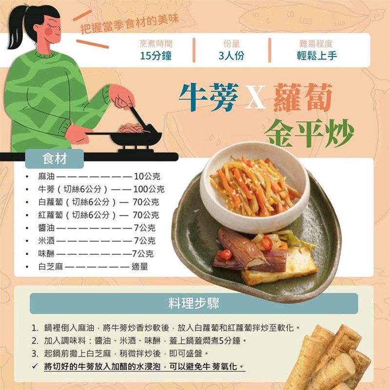 蔬菜界的保健食品 牛蒡高纖營養多 楊旻芳 |2022.03.23 語音朗讀 3598觀看次 字級 大 中 小 圖/123RF 【記者楊旻芳台北報導】現代人注重養身,常常會以天然的食物來做日常保健,而天然的保健食品除了人參、山藥之外,不可不知的就是有被稱為「東洋人蔘」的牛蒡。牛蒡是蔬菜中營養價值非常完整的食材,並且妙用多,不僅可以入菜、煮湯,也常被加工製成各類食品,非常萬用。牛蒡的小檔案牛蒡的外觀看起來黑黑髒髒的,不過可說是深藏不露的天然補品,牛蒡俗稱「牛大力」,台語諧音為「吳母」,在古時還有另一個別名叫「牛房」(即牛的尾巴),或許是因為它的食用部位「地下根」褐色細長的模樣就像是牛尾巴,後來逐漸演變成「牛蒡」,因為牛蒡長得和人參有幾分相像且營養價值高,也有人叫它「大力蔘」。牛蒡與日本有密切的關係牛蒡的原產地是在歐洲、西伯利亞及中國大陸等地,不過日本可說是促成牛蒡發光發亮的舞台,在日本的飲食文化中,牛蒡幾乎與「健康」、「養生」等形容詞畫上等號,幾乎家家戶戶都懂得善用這種保健蔬菜,因此牛蒡又有「東洋人蔘」的美名,目前台灣所栽培的品種就是從日本引進,主要產區分布在屏東、台南、嘉義、雲林等地,生長期較長的牛蒡一年一穫,目前3~4月正是產期。牛蒡營養高 妙用多根據台南將軍農會指出,外觀看起來不起眼的牛蒡,營養價值卻是數一數二的完整,甚至成為養生聖品,它含有豐富的水份、醣類、脂肪、蛋白質、維生素A、B1、C,以及鈣、磷、鉀、鐵等礦物質,最特別的是,牛蒡中還有一種很特殊的養分叫「菊糖」,與荷爾蒙分泌的精氨酸,人體筋骨、體力有極大的關係,另外,牛蒡亦含有大量的纖維素。牛蒡除了高纖,還含多種營養素,被認為是蔬菜中營養價值非常完整的食材,它的膳食纖維含量能促進腸道蠕動,排便順暢、增加飽足感。其內含多種多酚類植化素能提升肝臟的代謝能力與解毒功能,進而促進血糖、血脂的代謝,是三高病人可以多吃的好食材。圖/123RF牛蒡除了可以入菜、煮湯,也常被加工製成各類食品,像是牛蒡茶切片、牛蒡茶包、牛蒡蔘、牛蒡香脆片及牛蒡香鬆,及善用其高富含膳食纖維的特性研發出膳食纖維粉等。福報購嚴選多種牛蒡製品,牛蒡茶、牛蒡酵素、牛蒡脆片等等,帶給你健康養生的《蔬福生活》。《養生聖品—牛蒡相關產品請(點我)》牛蒡用處多,不只可以料理,還能製作成各式各樣的食品。圖/福報購牛蒡挑選與保存秘訣一、挑選去市場買牛蒡應該要怎麼挑呢?可挑選外表仍帶皮完整且還沾有泥土的品質比較好,如果太粗或出現空洞表示品質不好,另外鬚跟不要太多,太多的表示出土時間比較長較不新鮮了。另外挑選拿起來有重量的,表示水分多,肉質較不容易鬆散。最後則是看尾巴端自然彎曲垂下,口感較鮮嫩。二、保存買回家的牛蒡可以先用報紙包起來或放在木屑堆可幫助保持乾燥,放在冰箱冷藏或是陰涼通風的地方,牛蒡輕壓感覺變軟或是乾乾扁扁的表示不能食用了。2.已削皮的牛蒡可將削皮的部分沾鹽巴,再用保鮮膜包起來冷藏,避免氧化和水分流失,此方法約可保存3-5天。圖/農糧署三、烹調秘訣1. 牛蒡切開後容易氧化,可以泡醋水或鹽水來防止,醋水還可幫助消除苦澀味。2. 洗過的牛蒡容易變質,要盡快使用,另外其苦味很重,削皮切好後要立刻泡水。現在正是牛蒡的盛產季,《灃食公益飲食文化教育基金會》分享牛蒡的食譜,大家可以自行在家動手料理,煮出一道健康又養生的牛蒡金平炒。圖/灃食公益飲食文化教育基金會報導來源http://www.jiangjun.com.tw/main.asp?BodySel=S5&Pno=19https://www.fe-amart.com.tw/index.php/life-style/life-info/life-way/bun 前一篇文章 美與盟友擬將俄踢出G20 中印恐持反對票 下一篇文章 PLG/漂泊5年終回國 周儀翔:原來還有人知道我 熱門新聞 01華府櫻花綻放 吸引遊客2026.03.2802長照3.0增「互助喘息」 用服務換照顧2026.03.2803穩定物價 4月起電價凍漲 2026.03.2804雲林最炫兒童節 孩童搭乘熱氣球2026.03.2805宜蘭至羅東鐵路高架化 消除9平交道4陸橋2026.03.2806能源漲價 央行逐季檢視通膨2026.03.2807佛光山月光寺啟用 花蓮心靈新地標2026.03.2908推動科學辦案 鑑識權威李昌鈺87歲辭世2026.03.2909俄烏戰燒錢 普亭向俄富豪募款 2026.03.2810塞內加爾紀念碑 闡述販奴黑歷史2026.03.28 訂閱電子報 台北市 天氣預報 台灣一週天氣預報 相關報導 桃機3航廈屋頂 設10公里天溝國民黨中常會 提名台中、澎湖、竹縣長中美並重 鄭麗文傳6月訪美景氣分數衝高 燈號連3紅8萬小草力挺 柯:我不投降 718億新興計畫預算 政院不動 作者其他文章素食需求增2成 台北君悅飯店茶苑供蔬食餐點無心插柳柳成蔭 樸城草食打造植物系美式蔬食店疫情後吃健康 台北凱撒大飯店Checkers轉型蔬食吃到飽餐廳