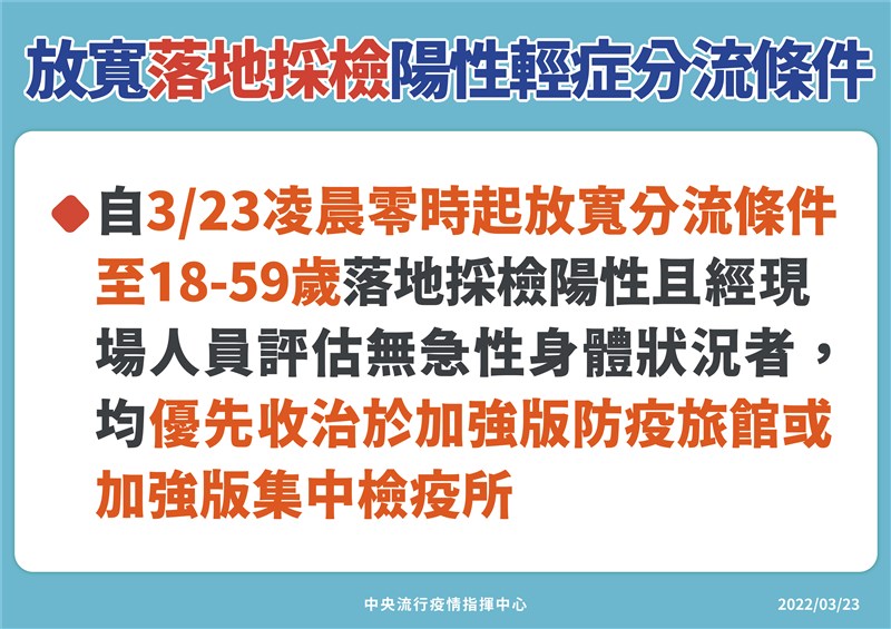 【本報台北訊】為防範新冠病毒進入社區,國內實施機場落地採檢兩個月餘。指揮中心醫療應變組副組長羅一鈞表示,近期陽性的個案數有增加趨勢,3月16日至22日驗出320位陽性個案,較前一周280人增加14%。為妥善分配醫療資源,原僅針對20至49歲輕症者分流至加強版集中檢疫所或旅館,明起將放寬年齡至18至59歲。