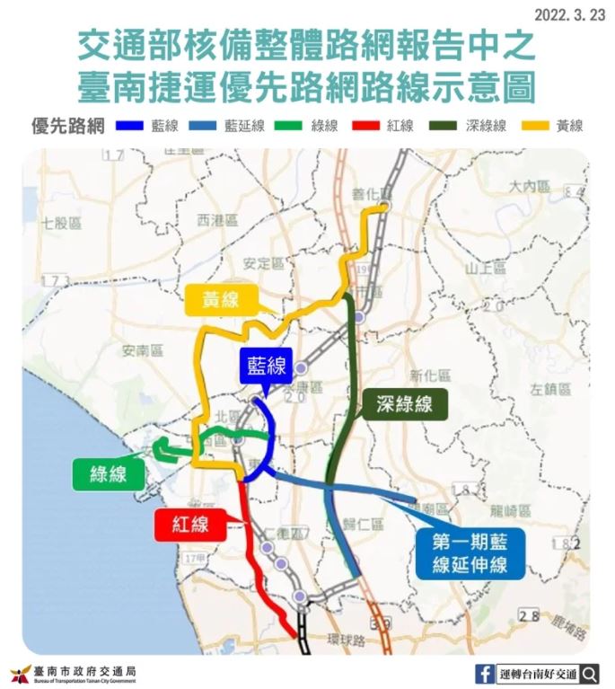 交通局表示,市長黃偉哲上任後,積極延續副總統賴清德時任台南市長時所推動促成的第一期藍線、藍線延伸線、綠線及紅線,刻正辦理規畫作業;另市長特別重視府城、南科及沙崙三核心生活圈的交通鏈結優化,路網規畫時特別納入深綠線及黃線,將塑造科技生活新廊道並帶動都會區蓬勃發展。