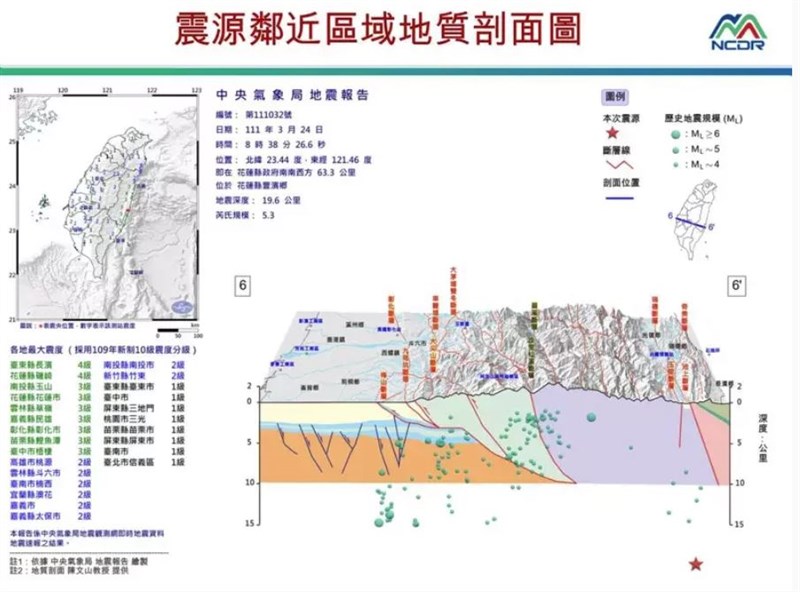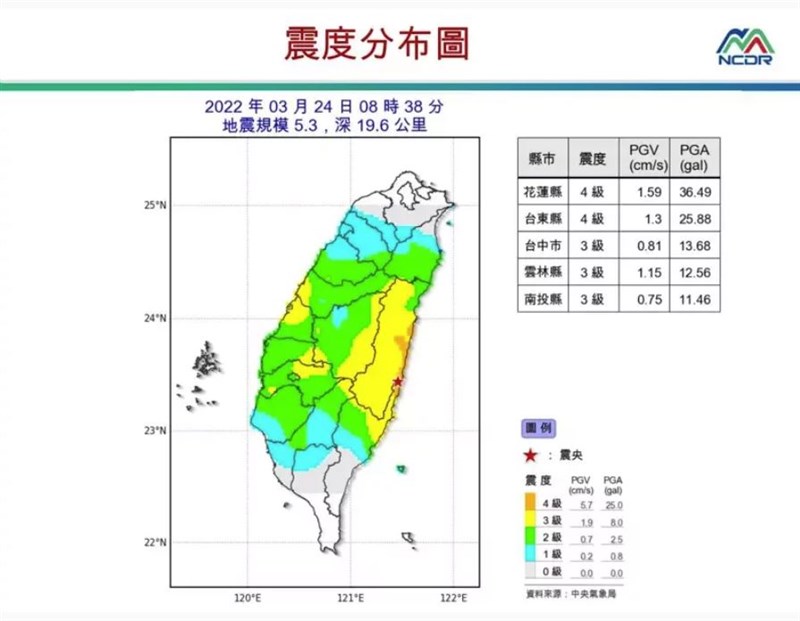 又在搖!花蓮台東上午8時38分同時地震 |2022.03.24 語音朗讀 838觀看次 字級 大 中 小 花蓮縣豐濱鄉24日上午發生芮氏規模5.3地震,最大震度台東縣、花蓮縣4級。圖/中央氣象局cwb.gov.tw 【本報台北訊】根據交通部中央氣象局最新資訊,花蓮縣豐濱鄉及台東縣長濱鄉今天上午8時38分同時發生地震,分別為芮氏規模5.3與4.7。花蓮縣政府南南西方63.3公里(位於花蓮縣豐濱鄉)上午8時38分發生芮氏規模5.3地震,地震深度19.6公里,最大震度台東縣、花蓮縣4級。台東縣政府北北東方80.6公里(位於台東縣長濱鄉)上午8時38分發生芮氏規模4.7地震,地震深度27.2公里,最大震度南投縣3級。各地最大震度級:東4花4投3雲3嘉3彰3苗3中3高2南2宜2竹2屏1桃1北1。圖/國家災害防救科技中心提供抗震3步驟 消防署籲謹記如何掌握地震前的黃金時間逃生,消防署災害管理組專門委員陳再通說,民眾在這10多秒時間內,應先掌握就地避難、保護身體原則,並謹記「趴下、掩護、穩住」的抗震3步驟。陳再通提醒,民眾若是夜間被國家級警報驚醒,神智不清就摸黑急忙下床,遇到地震搖晃反而可能容易受傷,建議平時應將床邊儲櫃移開或固定,並將掛畫或其他會掉落在床邊的雜物移開,如果因此生活不便,則建議「固定優於移除」。此外,若是睡覺時忽然遇到地震,建議民眾要先翻身,再用枕頭護住頭頸部,才能確保自己不受傷。圖/國家災害防救科技中心提供 前一篇文章 新聞千里眼 下一篇文章 陳時中證實 採購Novavax疫苗200萬劑 熱門新聞 01南華大學茶禪雅集 靜坐書寫時光膠囊2026.03.2602星雲大師靈骨分燈歐洲 傳燈萬方2026.03.2603佛光山365日越文版 贈西貢日航大酒店2026.03.2704紅綠葡萄抗氧化抗發炎 連皮吃獲取健康全效益2026.03.2705台灣工藝3專書 呈現文化獨特樣貌2026.03.2706中職37年 明大巨蛋開幕戰2026.03.2707兒童節禮物 新北學生自己票選2026.03.2608北京中學老師 精準預言美伊開戰2026.03.2609全球首例 菲國進入能源緊急狀態2026.03.2610滑雪勝地轉型 數位遊牧族進駐2026.03.26 訂閱電子報 台北市 天氣預報 台灣一週天氣預報 相關報導 中美並重 鄭麗文傳6月訪美景氣分數衝高 燈號連3紅8萬小草力挺 柯:我不投降 718億新興計畫預算 政院不動 能源漲價 央行逐季檢視通膨京華城案 柯文哲重判17年