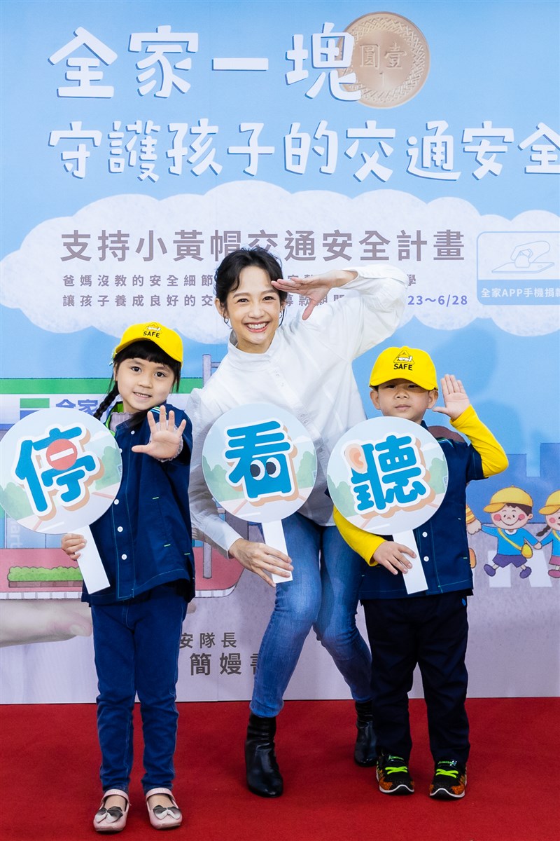 交安隊長簡嫚書與小朋友示範「停、看、聽」過馬路口訣,並呼籲親子到全家超商領「作業」、拿證書與限量小黃帽。圖/靖娟基金會提供