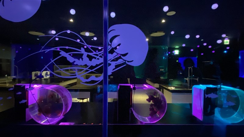 3樓「潮中舞者」結合有6個圓柱形水缸與炫目的聲光效果展示台灣海域常見的水母。圖/海科館提供4樓「潮水彩繪」主題區主要為彩繪互動投影區,也有人工繁殖小丑魚技術的「熊貓小丑魚」和其他外型特殊的小丑魚、以及有毒生物區「獅子魚和魨魚」為適合親子共遊共學的場域。此區另有「智慧水族缸」,遊客可以透過視線與不同手勢操作,在透明顯示螢幕上看到水族生物介紹資訊。
