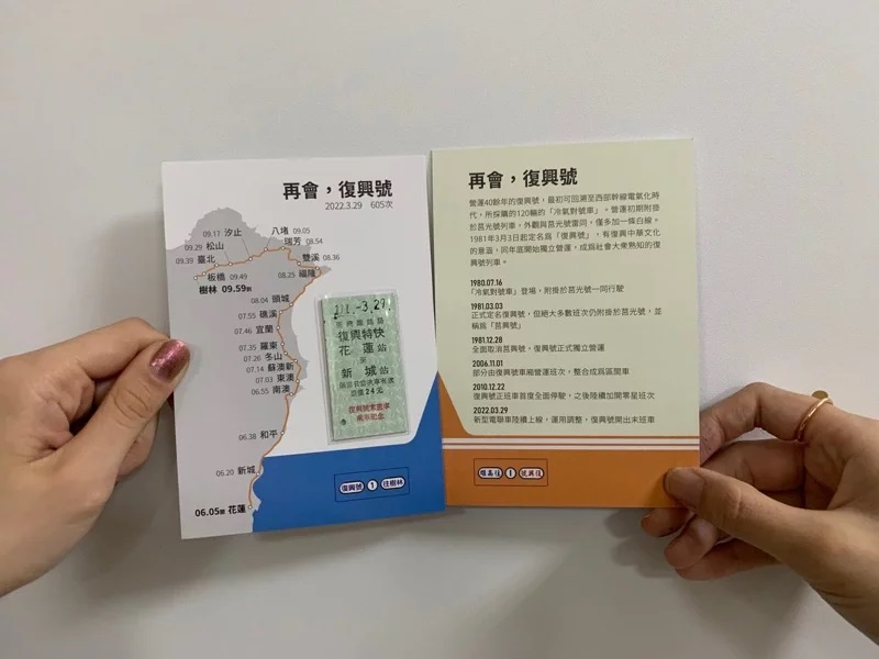 復興號將於29日開出花蓮至樹林末班車605次,台鐵發行復興號末班車紀念套票,每套150元,內含花蓮至新城復興特快名片式車票1張,車票背面劃有末班車座位號碼。紀念套票於28日上午9時發售,地點在台北站1樓服務中心前(150套)、花蓮站8號窗口(150套),每人限購1套,依序發售,不提供選號。