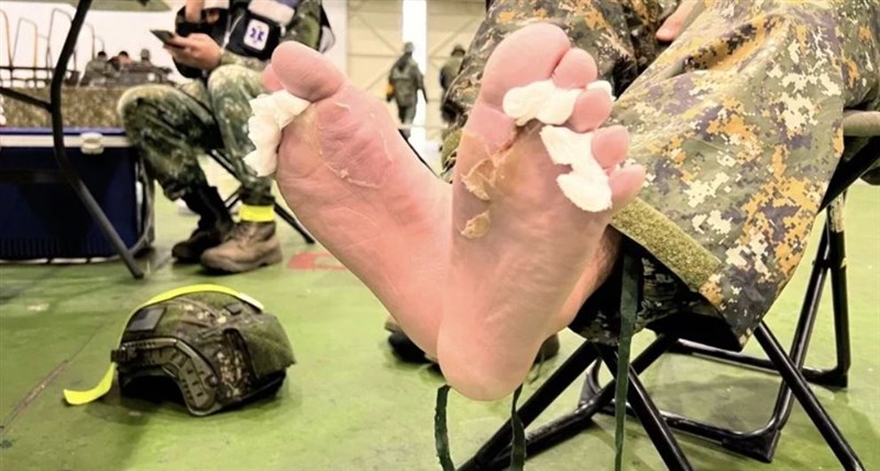 【本報台北訊】陸軍特戰部隊現正執行456公里不分晝夜的行軍訓練,航特部今(25)日表示,由於沿途氣候不佳,雨水浸溼官兵鞋襪,增加了摩擦力,許多參訓官兵因此患有水泡、汗疹、股癬,折磨鍛練特戰官兵作戰意志。