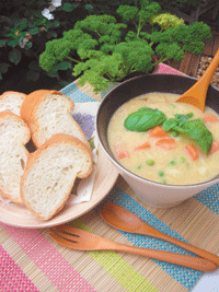 3. 待鍋中的食材都己煮熟後,最後加入青豆仁及椰奶,拌勻之後即可食用。可放入新鮮羅勒或九層塔葉片當成裝飾。