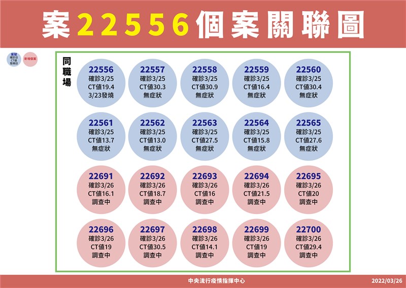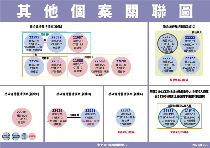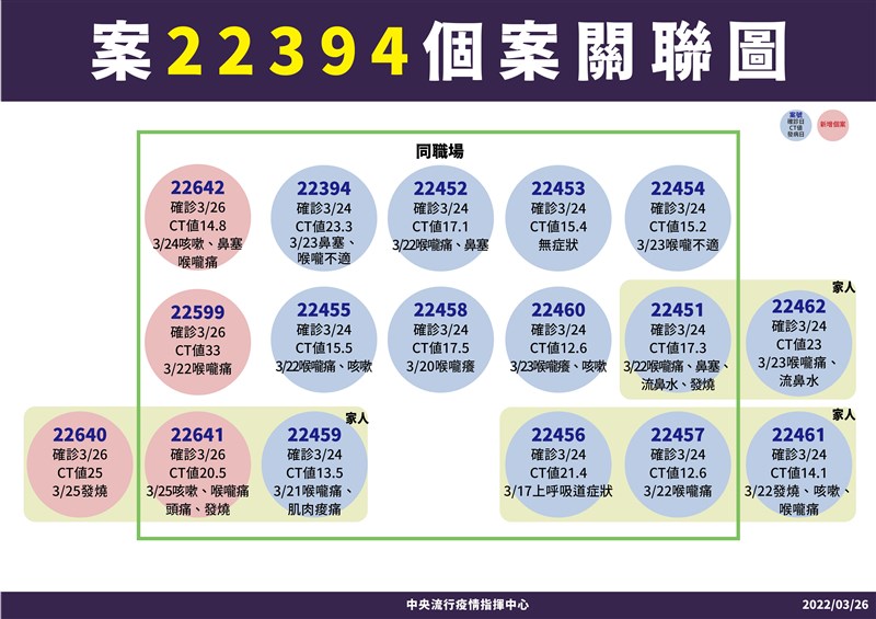 新北增2不明感染源 三重無症狀 是獨立個案 |2022.03.26 語音朗讀 877觀看次 字級 大 中 小 新聞示意圖,案22701,因為陪病需求,到醫院自費採檢為陽性。圖╱中央社 【本報台北訊】中央流行疫情指揮中心今(26日)公布,今新增103例確定病例,其中21例本土個案及82例境外移入,發言人莊人祥表示,境外移入35例為航班落地採檢陽性,沒有新增死亡個案。新增21例本土個案中,13例男性、8例女性,年齡介於10多歲至70多歲,居住地新北有11例、基隆5例、高雄4例及桃園1例。樹林某科技公司群聚增加10例,莊人祥表示,案號為22691至22700,其中新北有9例、桃園1例,該公司持續擴大採檢900人,其中980人陰性、10人陽性,確診10人都是公司員工,包括9名本國籍及1名外籍,Ct值介於14.1至30.5,將持續疫調釐清感染源。莊人祥表示,後續會再針對新確診的同住家人進行採檢,因為這次新增有9人是本國籍,需匡列同住家人。至於1名員工是桃園,莊說,平常他居住桃園,應是公司群聚相關。新北新增2案感染源不明,莊人祥說,中和區案22639為20多歲男性,為某公司職員,非目前匡列接觸者,他3月24日因發燒、流鼻水、喉嚨痛,自行快篩陽性後,就醫採檢陽性,Ct值為17.2 ,其住處與案22598相近。至於三重區案22701,為30多歲女業務員,因為陪病需求,3月25日到醫院自費採檢為陽性,Ct值12.3。莊人祥指出,中和區的新增個案,因為案22639和案22598住很近,也曾到同一間超商,但時間並沒有重疊,只能說足跡重疊,兩人是各自發病、各自採檢,目前先暫列相關。至於三重區個案Ct值12.3看起來像剛發病,目前無症狀,是獨立個案。關聯圖。圖/指揮中心提供基隆新增5例,莊人祥說,跟昨天公布群聚相關,案22638為另一警員,3月20日與案22596共餐,因此匡列為接觸者,案22687在3月24日和案22595共餐,被匡列為接觸者,另三案案22687至案22690,曾至銀河小吃店,經採檢陽性,Ct值介於12至15.9,將持續疫調釐清感染源。莊人祥表示,案22687是40多歲女性,起初是在銀河小吃店一起用餐,因而被匡列,後續應有去卡拉OK足跡。高雄新增4例與化學公司相關,莊人祥表示,案22599、案22641及案22642都是公司員工,案22640是案22459、案22641的同住家人,Ct值介於14.8至33.0之間,案22641、案22642是居家隔離後陰轉陽,將持續疫調釐清感染源中。莊人祥表示,此次新增都是同公司,且有2人是已隔離後續陰轉陽,且有症狀;確診者的同住家人大多也已被匡列。關聯圖。圖/指揮中心提供 前一篇文章 基隆+4 全市卡拉OK小吃店停業3天 下一篇文章 勞動部就業博覽會 預定4月重啟實體舉辦 熱門新聞 01銀杏點亮.東京印象2025.12.2302【遨遊藝事】 威尼斯沉船書店2025.12.2903【獻給動物朋友的詩】 最可愛的動物詩路2025.12.2504北捷英雄捨身救人 母盼菩薩接引2025.12.2305【守護家人】 為愛築家2025.12.2306以法相聚 佛光山員義工歲末聯誼2025.12.2407台北道場歲末聯誼 感謝義工同行菩薩道2025.12.2708【寰宇采風】京都最溫柔的秋色:紅葉永觀堂2025.12.2609社論--悲憐天下父母心2025.12.2510南天寺英文佛學營 佛青培養內在力量2025.12.24 訂閱電子報 台北市 天氣預報 台灣一週天氣預報 相關報導 冬候鳥大麻鷺 現蹤東沙環礁棘冠海星暴增 威脅珊瑚日月潭環湖車道 美景環抱機車考照變難 筆試改全選擇題元旦迎曙光 氣象署:成功率偏低今年最後一波冷氣團來襲 明天起回暖