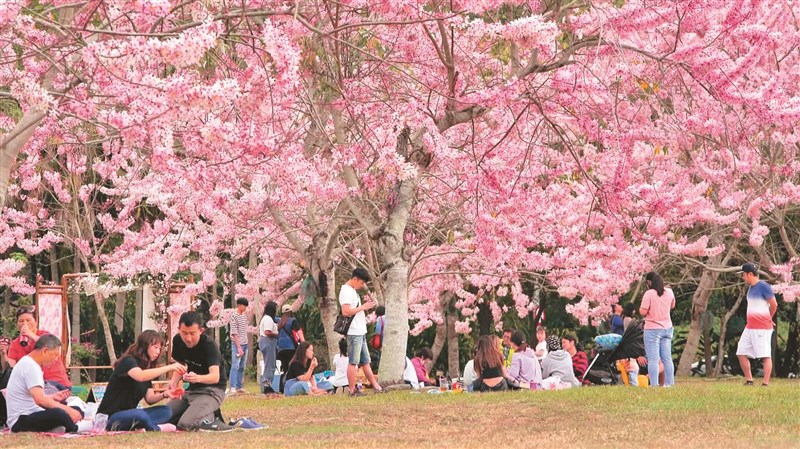 【本報台東訊】台東鹿鳴溫泉酒店戶外花園桃紅花旗木盛開,鹿鳴酒店結合花開邀請樂團,舉辦長達一個月的「鹿鳴桃花林音樂季」,四月每天上下午都有桃花林下音樂會,免費開放住宿鹿鳴的遊客,與台東縣民賞花。