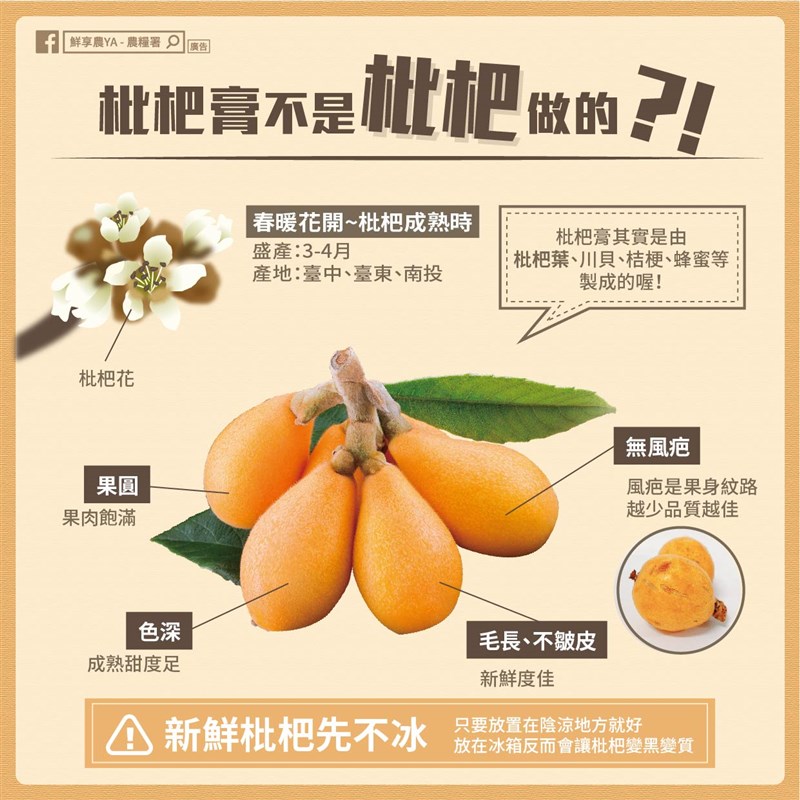 黃金水果枇杷 潤喉潤肺化痰止咳 |2022.03.28 語音朗讀 933觀看次 字級 大 中 小 每年3-4月,是枇杷的盛產季。圖/123RF 【記者楊旻芳台北報導】現在可以看到金黃色的枇杷出現在市場上,枇杷嬌嫩易受損,一年僅收成一次,採收期只有短短兩個多月,因此在市面上非常少見,現在正是枇杷的產季節,枇杷除了可以生吃,還可加製成工品果膏、果露等,枇杷葉則可以做成非常知名的枇杷膏。根據《本草綱目》所記載,枇杷能夠袪痰止咳、生津潤肺,清熱健胃,農委會表示,在購買時可掌握果圓、色深、毛長、不皺皮、無風疤5個原則,輕鬆挑選好吃的枇杷回家。枇杷小檔案枇杷的英文名叫Loquat,中文古名蘆橘,又名金丸、蘆枝,原產中國東南部,因果子形狀像琵琶樂器而名。枇杷與大部份果樹不同,在秋天或初冬開花,果子在春天至初夏成熟,比其他水果都早,因此被稱是「果木中獨備四時之氣者」。枇杷果肉酸甜適中且柔軟多汁,目前除了中國,日本、美國(夏威夷及加利福尼亞)、印度、巴西、以色列、土耳其、西班牙等地都有栽種。其中日本種植枇杷歷史已超過一千年。因枇杷樹形頗美,而且生長迅速,葉綠茂盛,在不少地方被栽種為園藝觀賞植物。蘇軾的詩《惠州一絕》亦曾提及這種水果:「羅浮山下四時春,蘆橘楊梅次第新。日啖荔枝三百顆,不辭長作嶺南人」。圖/農業易遊網枇杷從日本引進台灣栽培時,當時試了許多地方卻無法成功,最後終於在「太平頭汴坑」栽種成功。並透過公所與農會輔導與宣傳,讓「太平頭汴坑枇杷」最為聞名。台中市太平區因位於海拔高度適中,約三百五十至八百五十公尺,由於秋冬雨量少,日照充足,土壤肥沃,且有低溫,花芽形成及開花結果良好,每年約 9 至 12 月開花,花期長,花頂生,散發出特殊香味。枇杷果實成熟期約在 2 至 4 月,立春開始,枝頭上開始結滿結實纍纍的枇杷,黃澄澄的一片。枇杷表面光滑,外皮一般為淡黃色,亦有顏色較深,接近橙紅色的。果肉軟而多汁,有白色及橙色兩種;稱「白沙」及「紅沙」。當中白沙甜,紅沙較酸或頗酸。常見的茂木就屬於紅肉種。茂木是由日本引進的品種,產量佔比約90%,因為甜度高、口感好而受市場歡迎。枇杷的營養枇杷吃起來果肉多汁、清甜可口,枇杷營養豐富,有各種果糖、葡萄糖、鉀、磷、鐵、鈣以及維生素A、B、C等。當中胡蘿蔔素含量在各水果中排名第三。100克枇杷(約6顆)所含的維生素A約佔成人每日攝取量的30%,有助改善眼睛乾澀、疲勞,且能幫助上皮組織細胞癒合、改善皮膚乾燥問題,中醫認為枇杷果實有潤肺、止咳、止渴的功效。台中市太平區的枇杷品質其特色,是果粒碩大,質感好,而且色澤橙紅,甜而多汁,風味佳,為枇杷上極品。而枇杷具有潤喉,潤肺之功能、化痰止咳之特性,如果患小感冒,食用枇杷會有改善,是豐富營養,有益健康的水果,具高經濟價值,素有「黃金」水果之美譽,與南部的蓮霧可謂互相媲美。由於它的生產過程極其繁瑣,收成的果實更是嬌嫩昂貴,因此也曾有人以「水果仙子」稱呼。枇杷膏是枇杷葉製成 常常喝的川貝枇杷膏可不是由枇杷製成,而是枇杷葉製成,以大塊枇杷葉曬乾入藥,有清肺胃熱,降氣化痰的功用。但枇杷的種子及新葉輕微帶有毒性,生吃會釋放出微量氰化物,但因其味苦,一般不會吃到足以致害的分量。枇杷挑選5要領在市場看到枇杷要怎麼挑選呢?農委會建議,可掌握枇杷挑選5原則「果圓、色深、毛長、不皺皮、無風疤」,剛買回家的新鮮枇杷可以存放4~5天,只要放置在陰涼地方就好,放在冰箱反而容易變黑喔!圖/農糧署果圓:枇杷果粒越大且圓,代表果肉越多。色深:顏色越深且均勻代表成熟且甜度足。絨毛長:顯示極少接受人手碰觸,其新鮮度越好。不皺皮:如果果皮已經發皺就是放置時間太久,較不新鮮。無風疤:風疤是果身的紋路,越多代表陽光照射少,品質較差。怎麼剝枇杷最快?因為吃枇杷要先剝皮,不少人覺得麻煩,趕快把剝枇杷的小訣竅記起來吧!1、先拿湯匙將枇杷的表面刮過一遍,感受到顏色變深,摸起來較軟即可。2、手指抓果蒂,翻面,將底部蒂頭拔除,由此底部開始剝皮。報導來源:http://q.emmm.tw/?ptype=fckhttp://www.eastfa.org.tw/main.asp?body_sel=3_4_2_5https://ezgo.coa.gov.tw/Fruit/TW/Seasonfruits_Loquat 前一篇文章 PLG/射手布魯斯巫獅加盟 攻城獅外圍添火力 下一篇文章 本土+34 疫情多點延燒 再增不明感染源個案 熱門新聞 01水晶物理性 與化學性質2026.03.1702大馬急轉彎 撤回美對等貿易協議無效說 2026.03.1803越南大選 料共產黨壓倒性掌控2026.03.1604北美最乾燥加州死谷 罕見繁花錦簇2026.03.1805店貓上班摸魚睡翻 萌樣逗樂網友2026.03.1806新竹.尖石 群峰疊翠山色佳 泰雅歌聲伴霧霞2026.03.1607澎湖食農教育 向下扎根2026.03.1908美海軍引進機器人 爬牆維修艦艇2026.03.1909【分享時刻】某些愛2026.03.1810菲律賓萬年寺 民眾自發迎請 展現弘法成果2026.03.19 訂閱電子報 台北市 天氣預報 台灣一週天氣預報 相關報導 盧秀燕出訪 藍:有助化解疑美論總統登海鯤號 防長:不設定交艦時程考績法 擬取消甲乙丙丁等藍白拍板 聯合競選治理方向中選會人事 卓:提不同人選賴:台海和平 世界安全要素