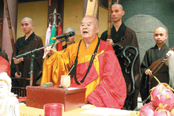 【人間社記者心樺、如介、江峰平大樹報導】「我是佛!」逾萬名信眾跟著佛光山開山星雲大師大聲虔誠的宣示,餘音響徹天際,繚繞耳旁,聞者莫不動容!「佛光山二○○八年甘露灌頂三皈五戒暨剃度典禮」八日上午在成佛大道舉行,禮請星雲大師、佛光山住持心培和尚、國際佛光會中華總會總會長心定和尚、清德寺住持慧龍法師、佛光山修持中心主任慧昭法師等五大師主法,參加信徒香會的數萬民眾也恭逢盛會。(人間社記者陳碧雲攝)