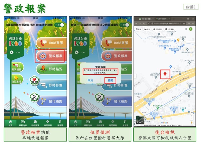 1968App推警政報案 防國道塞車 加速員警處理 |2022.03.29 語音朗讀 1088觀看次 字級 大 中 小 圖/高公局提供 【本報台北訊】國道去年A1事故死亡人數高達79人,較前年增加18人,其中有不少駕駛人在國道上發生拋錨、故障、追撞,卻因不知道怎麼處理,導致二次事故發生,釀成死亡車禍。為此,高公局表示,為了方便民眾快速通報國道事故,「高速公路1968」App提供「警政報案」功能,透過手機定位,公路警察勤務指揮中心可掌握報案所在國道位置,加速派遣轄區員警到場處理。高公局表示,一般用路人在高速公路發生事故時,都是直接撥打「110」報案,系統會先轉接到所在地縣市警察局勤務指揮中心,再轉派到國道公路警察局處理,如用路人不清楚所在位置,恐增派遣所需時間。高公局說,為加速國道事故處理時效,防止二次事故發生,高速公路局與公警局合作,利用「高速公路1968」App提供「警政報案」功能,藉由用路人手機定位資訊,直接將單鍵報案電話轉接至所在位置之轄區警察大隊勤務指揮中心處理,建議民眾使用該App時開啟手機定位資訊,以利該報案功能使用。圖/高公局提供此外,隨著清明連假將屆,恐湧現大批出遊、掃墓人潮,高公局也提醒,「高速公路1968」App「時間預測」功能,提供國道未來日與即時行車時間預測服務,可查詢未來100日內,任何時間行駛國道起終點交流道間的行車預測時間,查詢結果包含出發時間的前1小時,以及後2小時內行駛國道的預測時間外,並貼心建議當日最佳與不建議之出發時間。高公局表示,點選「時間預測╱即時規畫」功能時,系統即提供當下行駛國道起終點交流道的預計行駛時間、各路段行車速度、即時影像及天氣資訊。高公局提醒,本次清明節連假期間,西部國道及國5於假期第1天實施南向高乘載管制,假期前兩周日及假期第3、4天實施國5北向高乘載管制,請民眾多加留意並配合。圖/高公局提供 前一篇文章 新聞千里眼 下一篇文章 日本草莓又農藥超標 食藥署:日方可改准用農藥 熱門新聞 01【遨遊藝事】 威尼斯沉船書店2025.12.2902【中醫專欄】 中醫防失智之道2025.12.2703台北道場歲末聯誼 感謝義工同行菩薩道2025.12.2704看人間 厭童、厭老,然後呢?2025.12.3005新馬寺率大馬校長團 訪佛光大學2025.12.2706【閃文集】泰勒絲與狄金遜2025.12.3007宜蘭7.0地震 921後第3強震2025.12.2908當食物銀行義工 佛光人送暖2025.12.2709最好的辦法,就是繼續正常生活2025.12.2710【收穫滿滿】 快樂練氣功2025.12.30 訂閱電子報 台北市 天氣預報 台灣一週天氣預報 相關報導 元旦寶寶 桃園、新竹市逆勢成長小三通25年 台胞旅客連創新高嘉義蘭潭大白熊 可愛造型好療癒馬太鞍溪鋼便橋 今通車 堰塞湖壩頂降挖 已啟動跨年活動維安升級 安檢通道上陣政府撥補勞保法制化 立院三讀