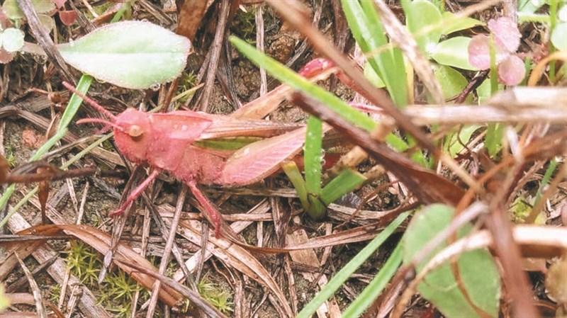 帕克近日在野外,發現罕見的粉紅色蚱蜢。圖/取自網路