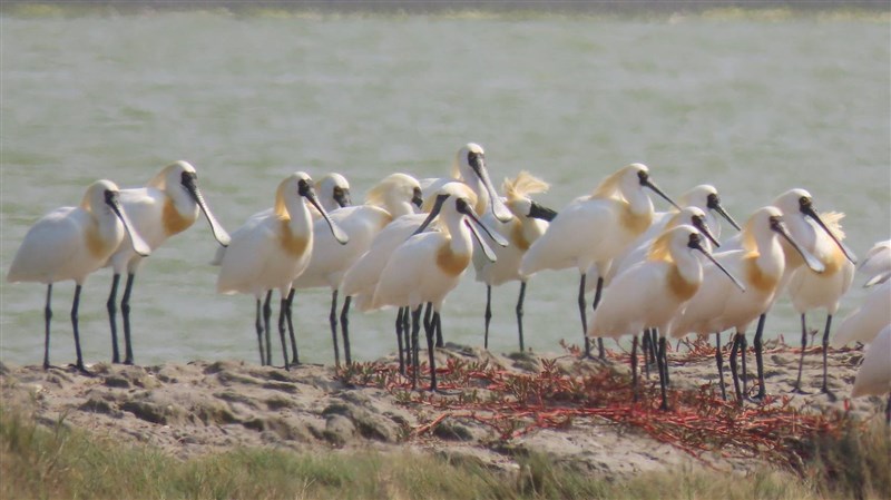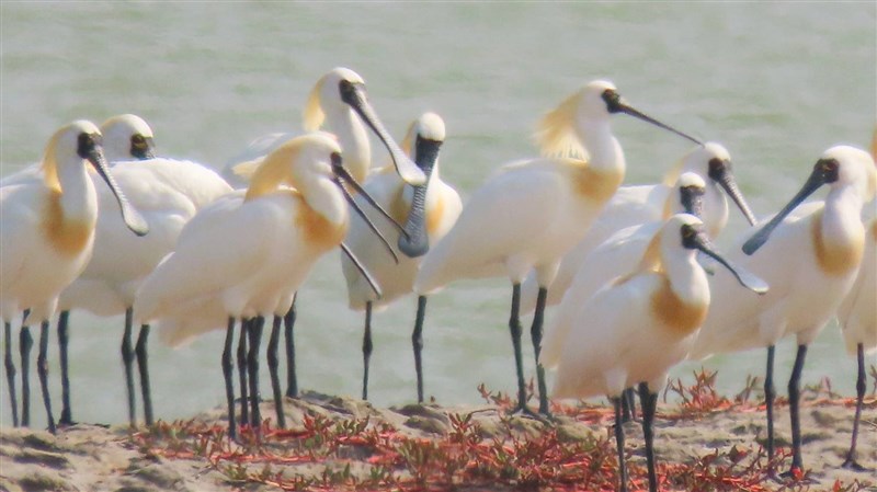 嘉義縣冬候鳥紛紛北返,換繁殖羽的黑面琵鷺,鳥頂豎立金黃色鳥羽,如「金毛獅王」。圖/蘇家弘提供