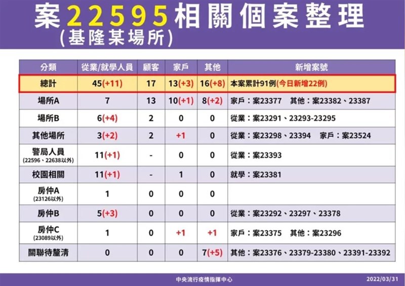 本土+87、境外+152皆創新高 基隆8例感染源不明 |2022.03.31 語音朗讀 2650觀看次 字級 大 中 小 31日本土確診新增87例,創下9個月新高。外界關心的基隆小吃店傳播鏈全案至今已累計91例,另有8例感染源待釐清。圖/林澔一 【本報台北訊】中央流行疫情指揮中心今(31)日公布,本土確診新增87例,境外移入個案增152例。指揮官陳時中表示,境外與本土個案都創下新高,其中本土僅16例為陰轉陽個案,目前大潭電廠針對外包商900多人也已採檢,今日增加10例確診,且定序出來為BA2.3是眾多案件中較為擔憂,又已外包商B家新增個案最多。而其他外界高度關心的基隆小吃店、台中婚宴群聚案也持續增加確診當中。陳時中表示,基隆小吃店傳播鏈今日增22例確診,加上截至昨天68例,全案至今已累計91例,有多個案住在外縣市。確診個案涉及場所多,包含有「場所A」增3人、「場所B」增4人、「其它場所」增3人,另外警局新增1人確診、校園新增1人確診。還有房仲業者ABC三處,其中B處跟C處各別增3人及2人,另外有5例還在釐清。圖/指揮中心陳時中表示,目前定序出爐,包含警察人員、學生有外擴等都有相同定序,大致上還需要更多定序去判定是否為同一組定序,總體的感染源待查個案維持19條個案,其中新北萬里個案、三峽個案和花蓮護理師(案23529)為新個案尚未歸類仍待釐清。至於台中婚宴群聚案,昨日3人確診後,今日再新增9人確診,婚宴全案總共12人確診。這12人當中,有前往吃飯聚餐有10人,其它2位是8歲小孩同住家人,本身沒有參加婚宴但確診。除了台中個案外,其他部分多住在台北,而高雄也有一位,另一位住在金門,曾在3月29日回金門被驗出來確診,已針對於同餐廳匡列採檢,下午會有進一步消息。目前已知台中婚宴確診者分布雙北、基隆市、新竹縣、高雄市和金門縣等七縣市。圖/Unsplash樹林的科技廠增加13例個案,有10位是工廠員工由陰轉陽性,2例是一位是已確診案23131的接觸者確診,列為案23521,另一位是已確診案22698的家人確診,列為案23383,目前整體案子看起來在控制之內。台東卑南家庭群聚新增4人確診,皆為已確診案23264的同住家人確診,部分基因定序出爐,顯示與新北社區群聚定序是較相同,陳時中說,但實際是否為一條線傳播,還需要探討,但目前列為同一個定序。新北中和大樓社區增加7人確診,從社區採檢站發現的有5位都有地緣關係,另外案23180是洗腎的相關病人,有2位女兒陪病也驗出確診,列為案23496、案23497。 前一篇文章 楊俊瀚站台全中運 懷念國中天真時光 下一篇文章 克拉術亞錦賽 我國2金2銀5銅創歷屆最佳 熱門新聞 01動物吃發酵花果 竟倒成一片2026.03.0802澳洲鸚鵡 吃芒果 成落果2026.03.0803台北燈節佛光山燈區 為民眾點亮光明希望2026.03.0704美伊續戰 桶裝瓦斯恐飆破千元2026.03.0705伊朗稱絕不投降 允暫停攻擊鄰國2026.03.0806星雲大師全集⑳【佛教管理學③】弘法系列人事篇-人事管理法⑨2026.03.0707東禪寺全民閱讀書展 書券贈偏鄉90校2026.03.0708美擬推AI晶片許可制 掌全球算力 2026.03.0709海習飛佛光緣 一日禪修2026.03.0710多倫多佛青祥獅賀歲 加國長者公寓送暖2026.03.07 訂閱電子報 台北市 天氣預報 台灣一週天氣預報 相關報導 賴總統籲國人植樹 創造永續家園藍原中央黨部 非不當黨產海鯤艦5度潛航測試 挑戰更深水域盧秀燕二度訪美 傳將拜會美政界油價波動 央行估通膨衝擊國道基金吃緊 擬發債借款因應