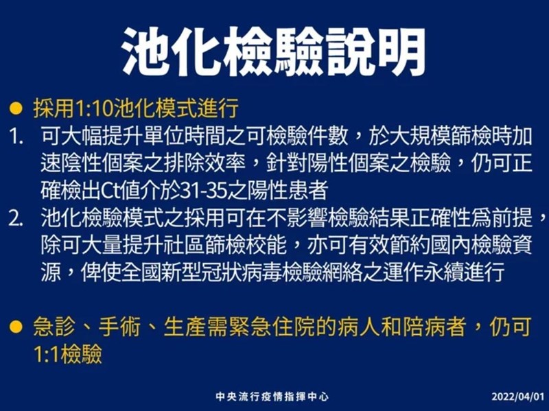 指揮中心醫療應變組副組長羅一鈞說,4月1日起,有一個新檢驗原則1:10的池化方式,不管是住院陪病等高風險篩檢,十個檢體一起上機篩檢,如果都是陰性就是陰性,如果有陽性分開再個別做,經評估可以提高效率,但不用於臨床有症狀就醫診斷,或防疫旅館的居家隔離、居家檢疫者,都不是用這個方式。