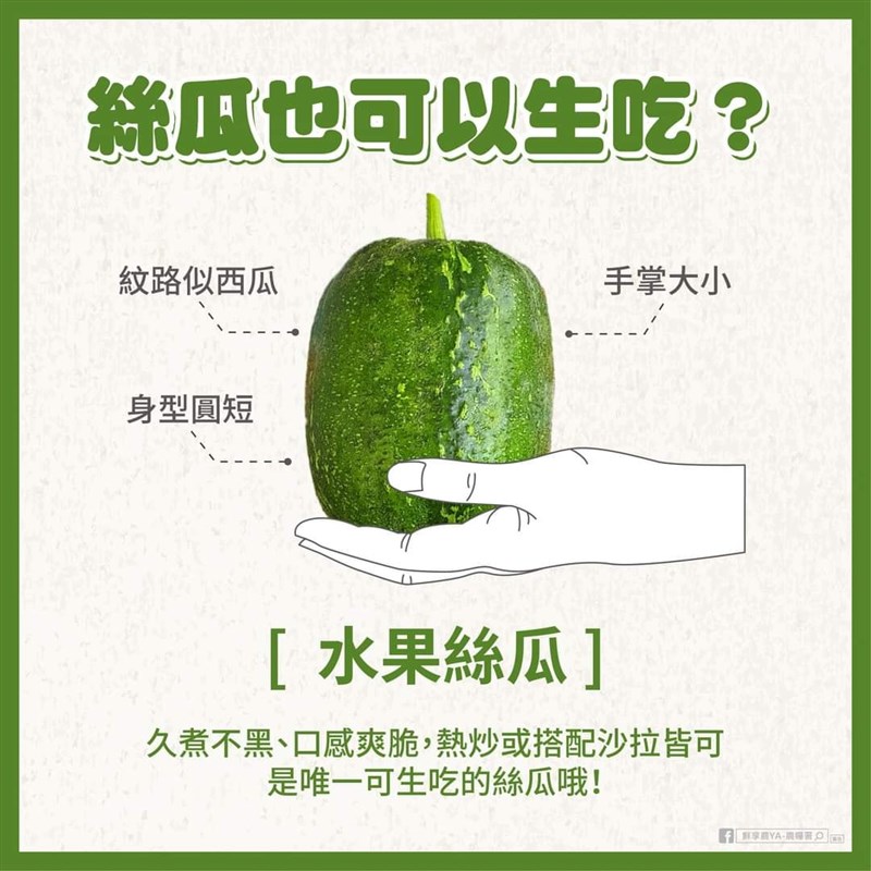 【記者楊旻芳台北報導】超市內近期出現一種看起來像絲瓜又像西瓜的植物,圓圓短短有著可愛的身形,到底是什麼?原來這是絲瓜的新品種「水果絲瓜」,特別的是,它竟然可以生吃,由於外型又圓又可愛,久煮不會變黑,受到許多家庭主婦的喜愛。