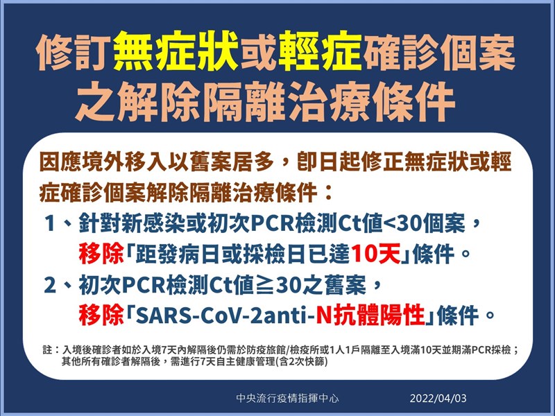 本土+183 保醫療量能 放寬解隔條件 |2022.04.03 語音朗讀 2244觀看次 字級 大 中 小 台南市府針對染疫足跡清消。圖╱中央社 【本報台北訊】本土疫情升溫,今天(3日)國內新增183例本土個案,以及97例境外移入個案,其中63例為落地採檢陽性。連3日個案數破百,病例快速增加對醫療量能是沉重負擔。指揮中心昨天宣布輕重症分流、擴大醫療量能等新制,今天指揮官陳時中則進一步宣布,確診者解隔離條件鬆綁。確診者解隔離條件鬆綁。圖/指揮中心提供陳時中表示,本土個案以個別傳播鏈來說,基隆小吃店的個案增加45例最多。陳時中表示,從1月1日至4月2日本土病例共1530例,其中輕症有1527人、占99.80%;中重症僅3人,占0.20%,因此經過專加會議討論認為,輕症者沒有必要待在治療場域可及早離開,因此放寬相關解隔離條件。本土病例分析。圖/指揮中心提供醫療應變組副組長羅一鈞表示,針對有些感染者因為卡在Ct值一直無法兩次達到30以上,因此修正無症狀或輕症確診個案解隔離條件,除新感染或初次PCR檢測Ct值小於30個案,移除「距發病日或採檢日已達10天」條件;另外初次PCR檢測Ct值30的舊案,移除「SARS-CoV-2anti-N抗體陽性」條件。不過,羅一鈞表示,入境後確診者如於入境7天內解隔後仍需於防疫旅館、檢疫所或一人一戶隔離至入境滿10天並期滿PCR採檢,其他所有確診者解隔後,需進行7天自主健康管理並進行兩次快篩。民眾赴傳統市場採購實名制,落實防疫。圖╱中央社規定修改前為須符合下列第一或二項,始得解除隔離治療,並進行7天自主健康管理。第一項是同時符合下列三款條件,包括退燒至少1天,且症狀緩解、距發病日已達10天的無症狀者、間隔24小時PCR檢驗結果為陰性或Ct值大於等於30。第二項則是第一次檢驗Ct值就大於等於30者,若符合無症狀、N抗體陽性、兩次PCR陰性或大於等於30,就視為舊案,也可提前解隔離。圖/指揮中心提供 前一篇文章 錦上添花! 故宮推「鏤繪集錦—緙繡山水人物特展」 下一篇文章 中職/轉隊首戰老東家兄弟 王勝偉開路先鋒 熱門新聞 01動物吃發酵花果 竟倒成一片2026.03.0802澳洲鸚鵡 吃芒果 成落果2026.03.0803台北燈節佛光山燈區 為民眾點亮光明希望2026.03.0704美伊續戰 桶裝瓦斯恐飆破千元2026.03.0705伊朗稱絕不投降 允暫停攻擊鄰國2026.03.0806星雲大師全集⑳【佛教管理學③】弘法系列人事篇-人事管理法⑨2026.03.0707東禪寺全民閱讀書展 書券贈偏鄉90校2026.03.0708美擬推AI晶片許可制 掌全球算力 2026.03.0709海習飛佛光緣 一日禪修2026.03.0710多倫多佛青祥獅賀歲 加國長者公寓送暖2026.03.07 訂閱電子報 台北市 天氣預報 台灣一週天氣預報 相關報導 賴總統籲國人植樹 創造永續家園藍原中央黨部 非不當黨產海鯤艦5度潛航測試 挑戰更深水域盧秀燕二度訪美 傳將拜會美政界油價波動 央行估通膨衝擊國道基金吃緊 擬發債借款因應
