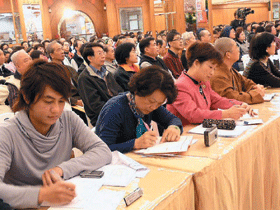 【記者羅智華台北報導】為增進民眾的佛學素養,培養正知正見的佛學思維,台北道場邀請南華大學執行董事依空法師以「佛性思想探微」為題,九日至十一日進行三天佛教經典講座,現場座無虛席,依空法師勉勵大家「佛性之前,人人平等」,只要有心有願,每個人都有成佛的機會。(記者羅智華攝)