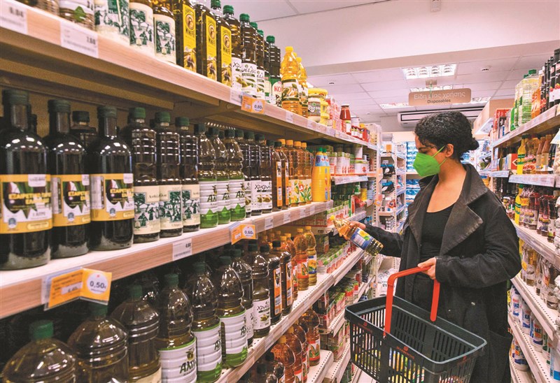 世界46.9%的葵花油出口來自烏克蘭,29.9%來自俄羅斯;WTO指出,俄烏戰爭亂局令食物價格更貴,將使今年的全球貿易成長率幾近腰斬。圖為希臘雅典一名顧客在超市裡挑選食用油。圖/新華社