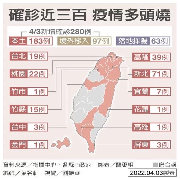 【本報台北訊】昨(3)日新增183例本土個案,再創這波疫情以來新高紀錄,也是本土病例連三日破百例。案例擴及全台12個縣市,北至基隆,南到墾丁,另有66零星個案尚待釐清感染源。