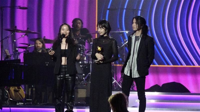李政瀚(右)、于薇(中)獲葛萊美獎,翻譯葉紫音(左)代為致詞。圖/中央社