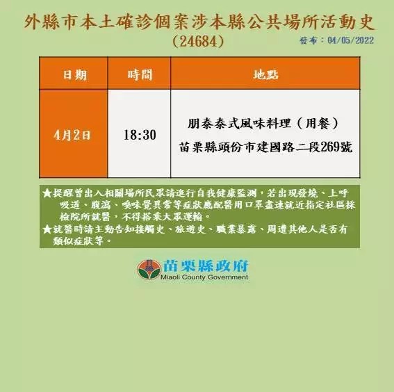 【本報苗栗訊】本土確診案例24684於4月2日晚上6時30分與親戚,到苗栗縣頭份市朋泰泰式風味料理聚餐,縣府衛生局依據感染風險評估後,匡列20名密切接觸者採檢後居家隔離,並完成公共場域清消,請民眾放心。