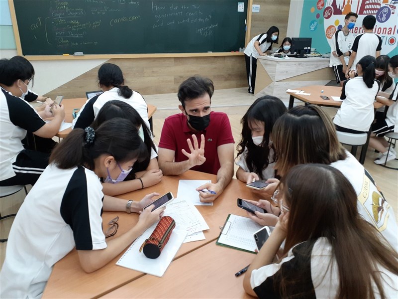 台中市長億高中雙語實驗班學生與外籍英語教師進行課堂互動及討論。圖/教育部提供