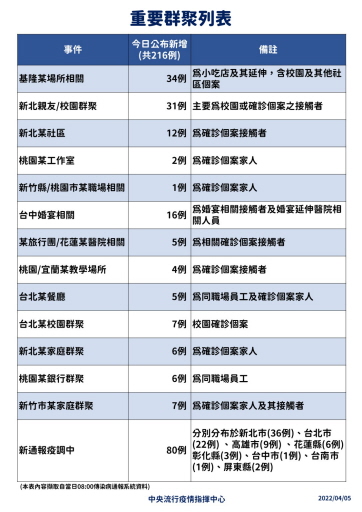 台中婚宴案新增個案,主要跟醫院內被匡列就地居家隔離等病房病患有關,由陰轉陽確診。其餘個別群聚,包含台北某餐廳5例,職場員工跟家人確診共5人。