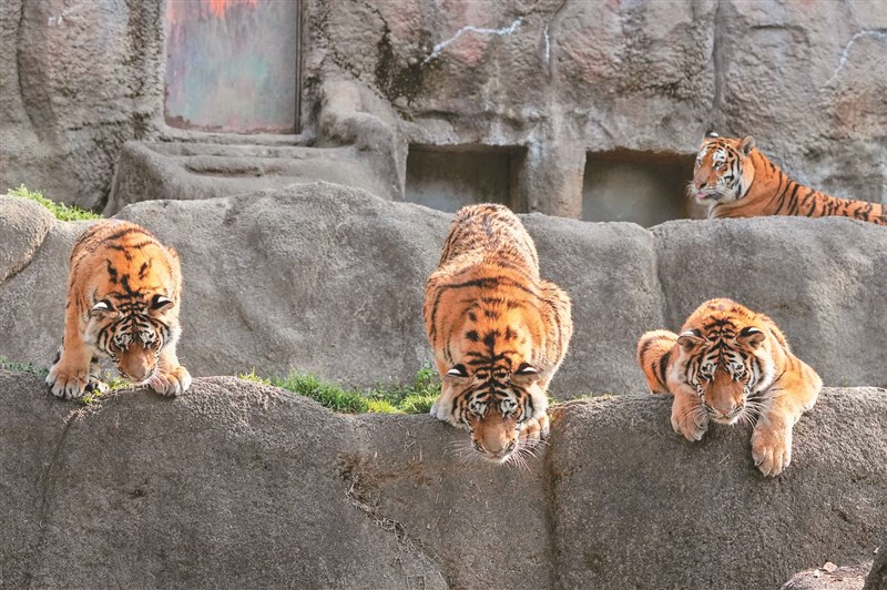 三隻老虎在岸上趴著,低頭看落水的玩具輪胎。圖/取自網路
