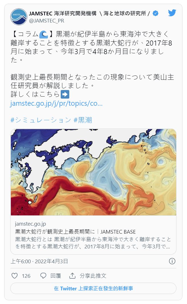 日本從1965年至今共發生6次「黑潮大蛇行」,但這次「黑潮大蛇行」竟持續4年9個月,創下觀測史上最長紀錄。圖/twitte @JAMSTEC_PR