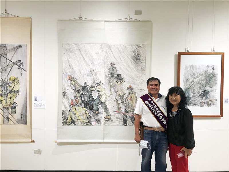 台電員工李升茂以水墨畫記錄搶修工程的艱辛歷程,8日在中正紀念堂揭幕。圖/中央社