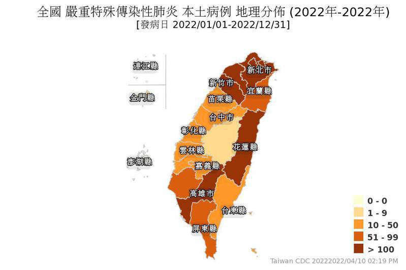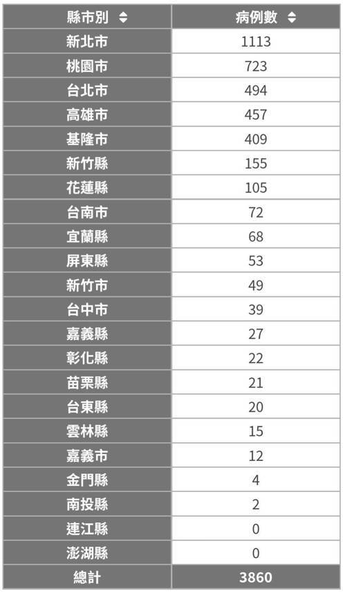 本土確診數「重災區」,以新北市1113例最高,也是國內目前唯一本土累計破千例的縣市。超過百例的有桃園市723例、台北市494例、高雄市457例、基隆市409例、新竹縣155例、花蓮縣105例。