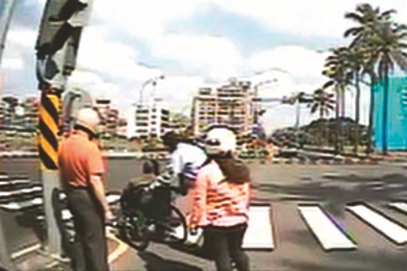 王可仁發現有身障者跌坐路中央,隨即將公車停妥擋住後方車流,下車協助身障者過馬路。圖/中央社