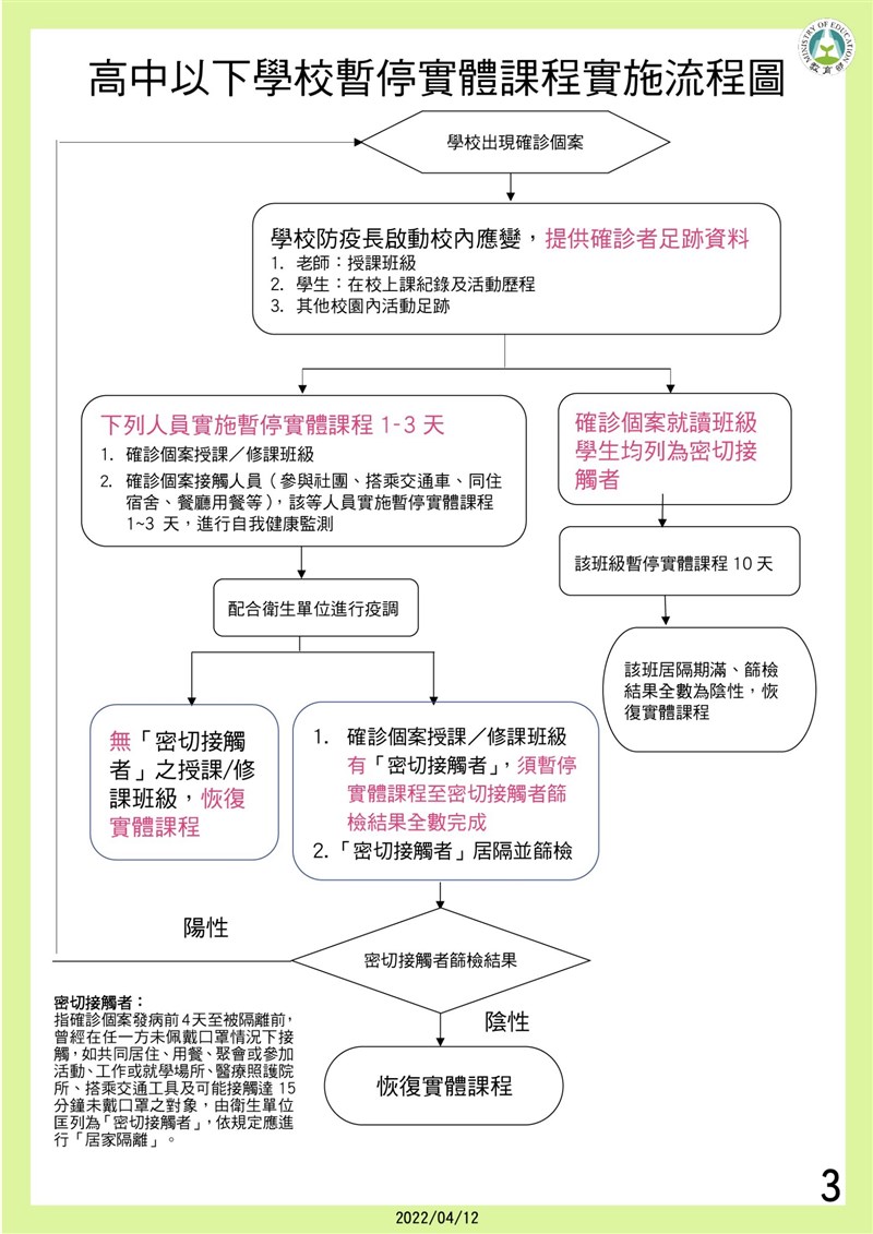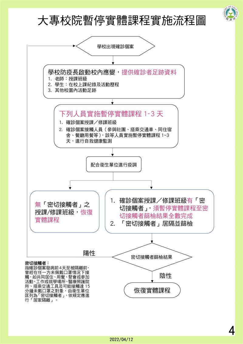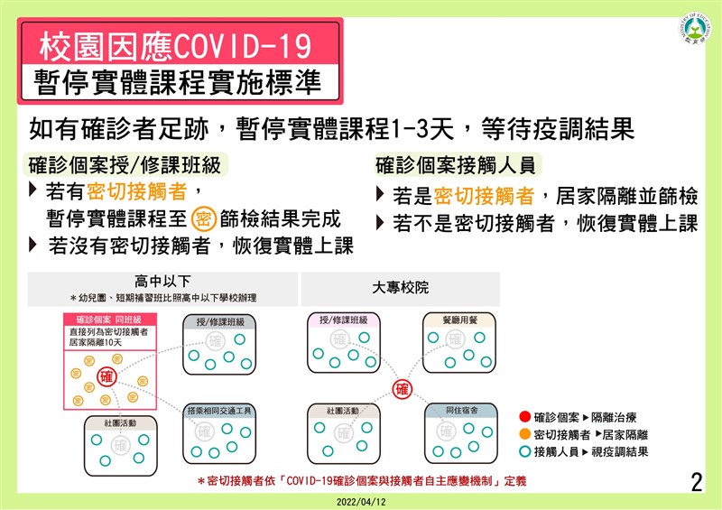 校園防疫新制 全校停課標準放寬 曾博群 |2022.04.12 語音朗讀 2980觀看次 字級 大 中 小 教育部修正發布校園因應疫情暫停實體課程實施標準。圖/資料照片 【記者曾博群台北報導】教育部今日表示,經與中央流行疫情指揮中心討論後,修正「校園因應『嚴重特殊傳染性肺炎』疫情暫停實體課程實施標準」,以確診個案之密切接觸者及其篩檢結果,將現行全校兩班確診停課標準,放寬至三分之一以上班級或全校達十班以上,教職員生為「確診個案」、「密切接觸者」才會全校停課10天,並暫停實體課程。教育部說明,各級學校如有發生教職員工生為確診個案,依據中央流行疫情指揮中心公布之「確診個案與接觸者自主應變機制」由學校「防疫長」依據學校持續營運計畫,提供確診個案足跡資料(如教師授課班級、學生在校上課紀錄及活動歷程等),並配合疫情調查由衛生單位匡列「確診個案之密切接觸者」。圖/教育部提供教育部表示,確診個案就讀班級之學生,因長時間共同生活學習生活,均列為「密切接觸者」進行「居家隔離」,此班級於居家隔離期間暫停實體課程10天,待篩檢結果全數為陰性,則全班恢復實體課程。疫情調查期間,確診個案校內活動足跡之「接觸人員」(包含修課、授課、參與社團、搭乘交通車、同住宿舍、校內餐廳用餐…等),該等人員暫停實施實體課程1至3天,並應進行自我健康監測,學校亦應進行環境清潔消毒。若確診個案授課/修課班級如無被匡列為密切接觸者,恢復實體課程;確診個案授課/修課班級如有被匡列為密切接觸者,密切接觸者須居家隔離並進行篩檢;密切接觸者篩檢結果如為陰性,其授課/修課班級恢復實體課程;如密切接觸者之篩檢結果為陽性,則重新進行「確診個案」相關人員之調查造冊流程。圖/教育部提供疫情調查結果,學校有三分之一以上班級或全校達十班以上班級「確診個案」、「密切接觸者」暫停實體課程10天,該校得實施全校暫停實體課程,該校教職員工生應進行「自我健康監測」。短期補習班及幼兒園等,比照高中以下學校規定。大專校院部分,學校有三分之一以上「確診個案」、「密切接觸者」,科、系、所之班組暫停實體課程10天,該校得實施全校暫停實體課程,該校教職員工生應進行「自我健康監測」。學校或校(區)暫停實體課程實施期間,得縮減上課周數,採一學分十八小時彈性修課,以線上課程或於周間補課等方式辦理。暫停實體課程實施期間,學校教職員生以彈性措施進行線上同步或非同步之遠距教學,此外,學校應配合衛生單位進行校園清潔消毒。圖/教育部提供教育部表示,各級學校及地方政府須依本暫停實體課程實施標準據以落實執行,教育部並將成立暫停實體課程實施應變小組,協助學校、各縣市政府處理暫停實體課程實施相關疑義,如欲採取有別於本實施標準之作法,應與本部應變小組研商後實施,以兼顧校園健康安全,並保障學生受教權益。圖/教育部提供圖/教育部提供 前一篇文章 台北市政府驚傳1員工確診 10樓軟性封鎖 下一篇文章 小小銅板自立希望 郭書瑤挺唐寶寶籲捐零錢 熱門新聞 01南華大學茶禪雅集 靜坐書寫時光膠囊2026.03.2602星雲大師靈骨分燈歐洲 傳燈萬方2026.03.2603佛光山365日越文版 贈西貢日航大酒店2026.03.2704紅綠葡萄抗氧化抗發炎 連皮吃獲取健康全效益2026.03.2705台灣工藝3專書 呈現文化獨特樣貌2026.03.2706中職37年 明大巨蛋開幕戰2026.03.2707兒童節禮物 新北學生自己票選2026.03.2608北京中學老師 精準預言美伊開戰2026.03.2609滑雪勝地轉型 數位遊牧族進駐2026.03.2610全球首例 菲國進入能源緊急狀態2026.03.26 訂閱電子報 台北市 天氣預報 台灣一週天氣預報 相關報導 景氣分數衝高 燈號連3紅8萬小草力挺 柯:我不投降 718億新興計畫預算 政院不動 能源漲價 央行逐季檢視通膨京華城案 柯文哲重判17年台東實彈操演 美技術人員在場 作者其他文章世世動了心 陸平台3天破500萬觀看台師大參照古籍 重建600年颱風史台首創AI步行機器人 加速中風患者復健肌少症非銀髮族獨有 研究籲篩檢提前至50歲林惠理2萬葉材築葉語 永續呈現大地語言華文文學星雲獎 隱地獲貢獻獎