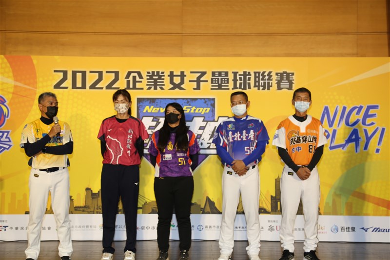 企業女子壘球聯賽開賽記者會,各隊總教練上台致詞。圖/體育署提供