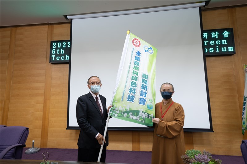 永續發展與綠色科技國際研討會明年將移師佛陀紀念館舉行,副館長永融法師(右)代表接下大會舉辦旗,左為南華大學校長林聰明。圖/南華大學提供