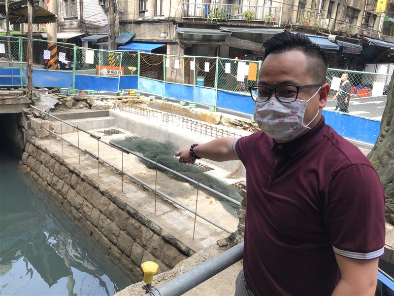 基隆市忠三橋改建近日掀開橋面後,發現疑似日治時期逾百年旭川河岸壁駁坎重見天日。圖/中央社