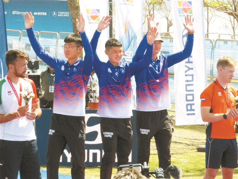 中華反曲弓男團蘇于洋(左二起)、湯智鈞、魏均珩,上周在世界杯土耳其站摘金。圖/中華射箭協會提供