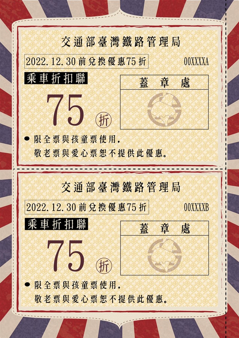台灣觀巴台鐵護照開賣!限量3000本 |2022.05.05 語音朗讀 1911觀看次 字級 大 中 小 交通部觀光局及台鐵局輔導台灣觀巴協會規畫推出「台灣觀巴臺鐵護照」,限量發行3000本。圖/參山國家風景區管理提供 【本報台北訊】交通部觀光局與台灣鐵路管理局共同合作輔導台灣觀巴協會規畫推出「台灣觀巴台鐵護照」,每本護照內含台鐵列車乘車75折折扣聯及「台灣觀巴」套裝旅遊行程500元抵用聯各2聯,優惠期限自即日起至12月30日止,限量發行3000本,售價新台幣790元,民眾可透過台灣觀巴各營運旅行社或郵政商城購買。台灣觀巴協會理事長張龍麟說,「台灣觀巴」套裝旅遊行程500元抵用聯適用於購買「台灣觀巴」各套裝旅遊行程,數量有限欲購從速。另遊客參加行程後,還可投稿參加「2022年台灣觀巴攝影比賽推廣活動」,有機會獲得1000元至2萬元不等的獎金。兩張面額500元的台灣觀巴行程折抵券。圖/交通部觀光局提供交通部觀光局表示,「台灣觀巴」是觀光局輔導推動的旅遊產品品牌,為台灣自由行旅遊首選,主打1至4人成行小團出遊,保險及行程規畫皆包含在套裝遊程內,於飯店、車站、機場等重要交通節點出發,車內提供免費Wifi、全程導覽解說,提供旅客貼心便捷的服務,行程遍布全台。目前由26家旅行社推出6大主題共91條深度體驗行程,行程結合當地色餐食及體驗活動,並持續做好防疫措施,不論是1個人旅遊或與特定的家人、三五好友出遊,都是輕鬆安全旅遊的最佳選擇。交通部觀光局說明,「台灣觀巴台鐵護照」結合觀光旅遊與公共運輸,提供遊客更優惠便捷的旅遊服務,遊客不必自行開車,安心放鬆的享受旅程,且每本護照內含2聯「台灣觀巴」套裝旅遊行程500元抵用聯及2聯台鐵列車乘車75折折扣聯,護照價值遠超過售價790元。台鐵購票75折優惠券。圖/交通部觀光局提供台鐵列車乘車75折之折扣優惠由台鐵局專案提供,適用於各車站售票窗口臨櫃購買各級列車「全票」、「孩童票」及既有車型優惠,如柴聯自強號周一至周四票價原已打97折,使用折扣聯可再打75折,旅客出示護照並由售票員撕下折扣聯,每張車票限使用1張折扣聯,不限乘車區間長度。旅客也要注意,如遇3日(含)以上連續假日、觀光列車、郵輪式列車、實名制列車、騰雲座艙及其他台鐵局指定列車不適用,且不得與其他優惠(如早享優惠) 重複使用。12月30日為折扣聯最後使用期限,當天仍可預購28天內車票,有關退換票事宜,一律適用台鐵現行一般車票退換票規定。 前一篇文章 竹苗自行車道周六通車 一路順騎免走西濱 下一篇文章 不明瘀青、出血點 當心免疫性血小板減少症 熱門新聞 01華府櫻花綻放 吸引遊客2026.03.2802長照3.0增「互助喘息」 用服務換照顧2026.03.2803穩定物價 4月起電價凍漲 2026.03.2804雲林最炫兒童節 孩童搭乘熱氣球2026.03.2805宜蘭至羅東鐵路高架化 消除9平交道4陸橋2026.03.2806能源漲價 央行逐季檢視通膨2026.03.2807佛光山月光寺啟用 花蓮心靈新地標2026.03.2908推動科學辦案 鑑識權威李昌鈺87歲辭世2026.03.2909俄烏戰燒錢 普亭向俄富豪募款 2026.03.2810塞內加爾紀念碑 闡述販奴黑歷史2026.03.28 訂閱電子報 台北市 天氣預報 台灣一週天氣預報 相關報導 電梯按鍵怎麼取消? 網友指出還有這招基隆和平島阿拉寶灣5月開放 即日起可網路預約北捷引進南韓樂鐵電聯車 乘車空間更寬敞屏東藝起派對移師潮州 寫生比賽29日截止報名閒置多年轉型 花蓮鳳林新露營地4星高規格新景點「樹鼠」? 台南安平樹屋標成「tree mouse」