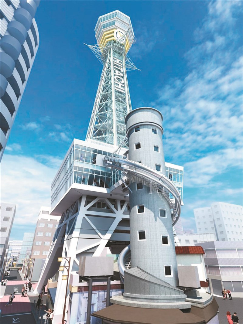 網路媒體Impress Watch報導,負責營運通天閣的「通天閣觀光公司」,二○二一年十二月動工興建全長約六十公尺的巨型溜滑梯,近日已完工,四月十六日邀相關人士舉行「試滑會」。這座巨型溜滑梯名稱為TOWER SLIDER,九日上午十時正式對外營業。