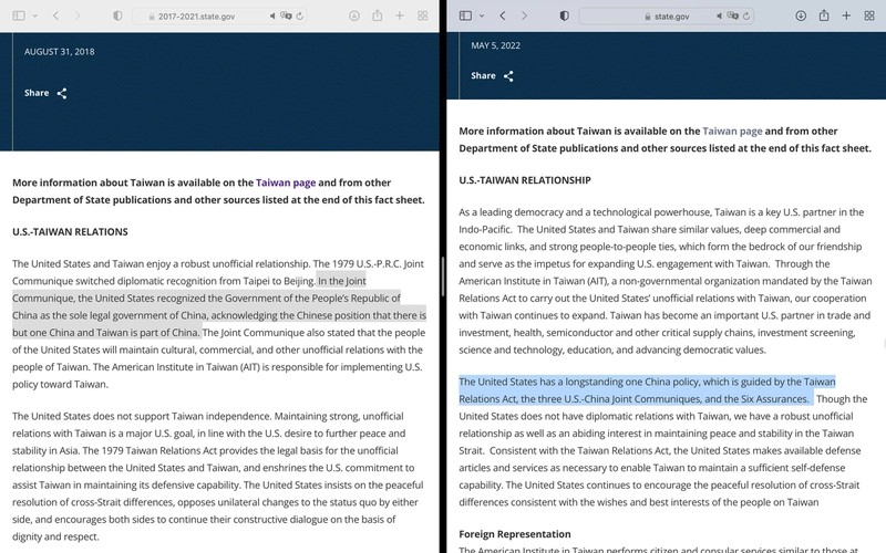 美國國務院大幅度更新網站上的美台關係現況描述成果清單(右),移除2018年舊版(右)的「台灣是中國的一部分」、「不支持台獨」等用語,新增「基於台灣關係法、美中三公報和六項保證的長期『一個中國』政策」。圖/取自美國國務院網站