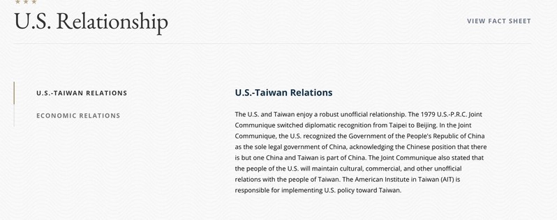 美國國務院網站更新美台關係現況描述成果清單(Fact Sheet),但在台灣頁面上仍保留2018年的摘要。圖/取自美國國務院網站