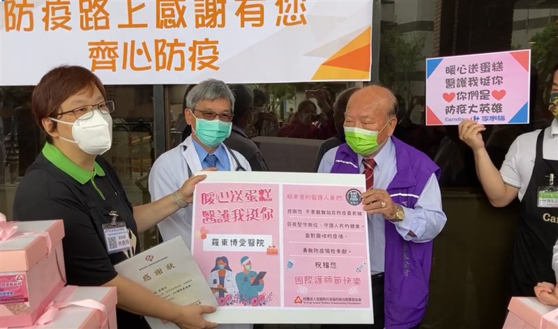 疫情期間,家樂福宜蘭店配合縣府防疫工作,不只設置疫苗快打站,也多次捐贈物資送到醫院,今天特地選在國際護師節前夕,與宜蘭聯勸準備共90個愛心蛋糕,親自前往陽明交大醫院、羅東聖母醫院及羅東博愛醫院給護師加油打氣。