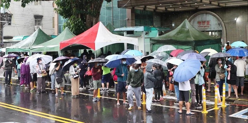 新冠疫情升溫,持陽性快篩試劑等待PCR採檢的人龍,下雨天仍出現在醫院急診室外。圖/潘俊宏
