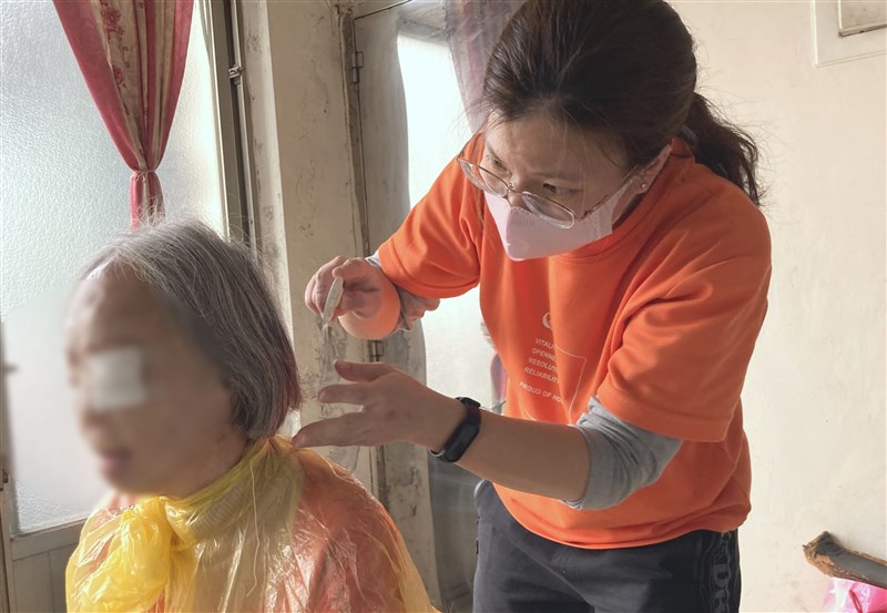 張晉僖(右)致力照服工作,是因為許多感動與收穫,包括長輩願意當她的啦啦隊,圖為幫美櫻阿姨理髮。圖/弘道老人福利基金會提供